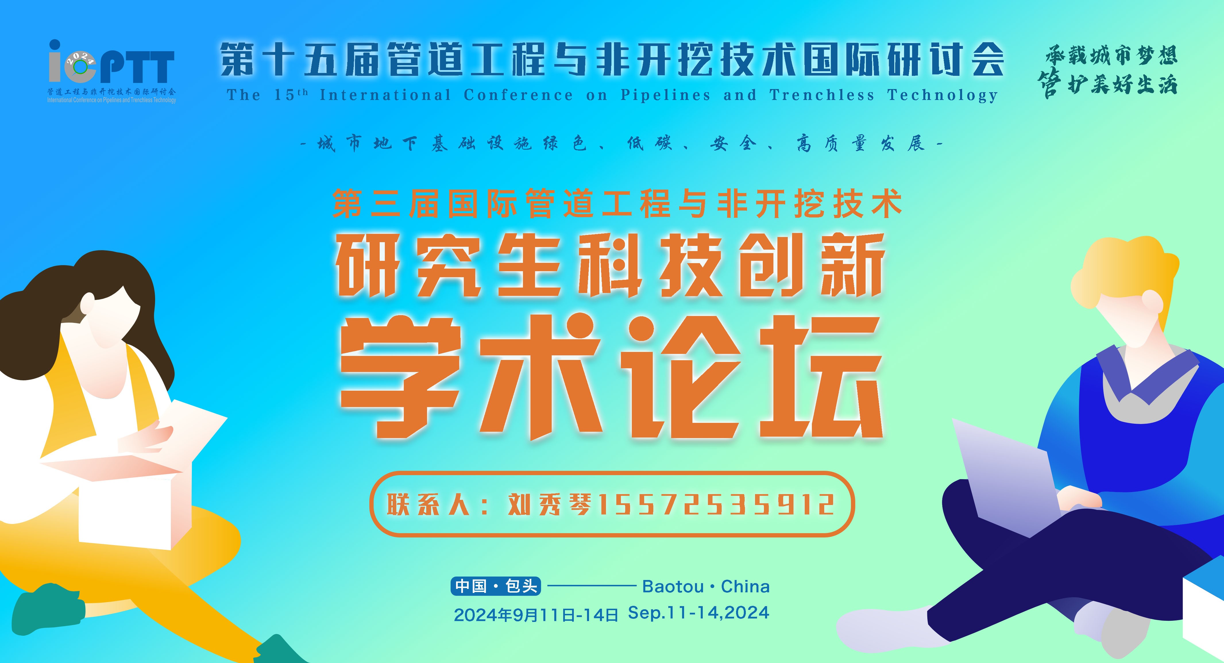 ?關(guān)于舉辦第三屆國(guó)際管道工程與非開挖技術(shù)研究生科技創(chuàng)新學(xué)術(shù)論壇的通知 ? ? ? ? ? 為了持續(xù)更好地推動(dòng)管道工程和非開挖技術(shù)領(lǐng)域創(chuàng)新性科研成果、新技術(shù)和先進(jìn)工程經(jīng)驗(yàn)的探討、交流和復(fù)雜問題的協(xié)同研究,促進(jìn)管道與非開挖工程領(lǐng)域政、產(chǎn)、學(xué)、研、用的共同進(jìn)步,快速提高管道建設(shè)水平,服務(wù)于我國(guó)城市地下管線基礎(chǔ)設(shè)施建設(shè)與更新改造,中山大學(xué)、內(nèi)蒙古科技大學(xué)、同濟(jì)大學(xué)、鄭州大學(xué)、長(zhǎng)江生態(tài)環(huán)保集團(tuán)有限公司、壩道工程醫(yī)院等單位將于2024年9月11-14日在中國(guó)包頭市共同組織召開“第十五屆管道工程與非開挖技術(shù)國(guó)際研討會(huì)(ICPTT 2024)”。 ? ? ? 為鼓勵(lì)和促進(jìn)研究生科技創(chuàng)新